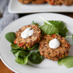 I topped them off with a minty yogurt sauce made with lemon to brighten the flavors and add moisture. Enjoy these burgers on top of salad greens or in between two toasted buns with a schmear of sauce on top.
