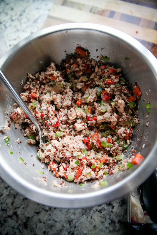 I used a 14 ounce can of wild Pink salmon from Whole Foods. Yes there is skin and bones in there, but if you just mash it all up you will never notice! The bones are soft and mashable and are not the kind of fish bone to fear getting stuck in your throat. Be brave friends!
