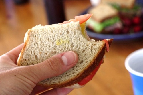 Arnold Rye bread with ham, cheese, tomato, pickle , mustard and even a little mayo. I wanted a 100% authentic childhood sandwich. But something was missing. I think the nuts and seeds of Great Harvest…