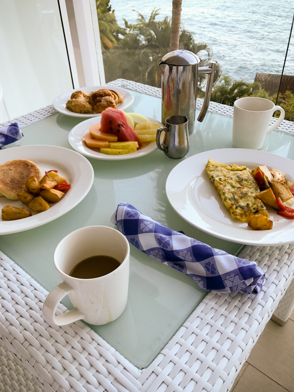 We had four whole days and two travel days on our trip, and they flew by. On our third morning, we had to be at the beach early for our tour (8:45 – vacation early), so we ordered a room service breakfast to fill us up. The best thing about all-inclusive resorts is it’s all included! Fruit, an omelet, baked goods, coffee.