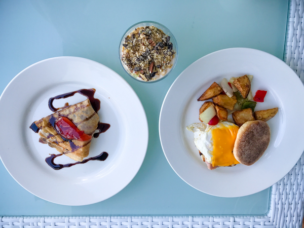 On our final full day, we had breakfast on our balcony again so we could relax a bit more before getting all sunscreened up for the day. Granola parfait, breakfast sammie, chocolate and strawberry crepes.