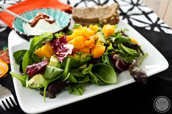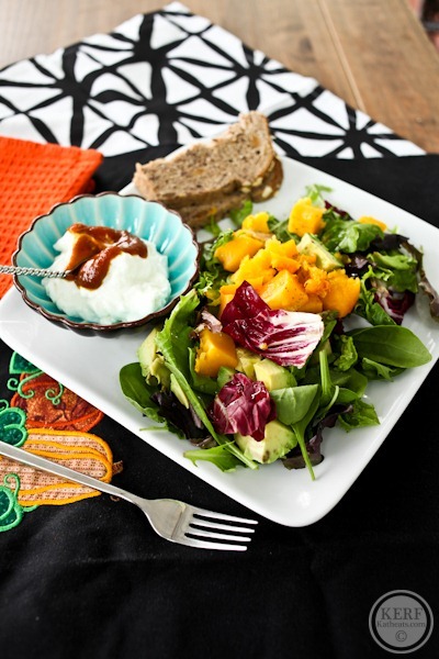 Salad with avocado and leftover squash and a drizzle of smoked maple syrup we sell at the bakery