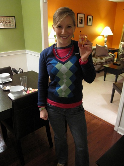 Looks like a fun dinner! That drink really is tiny! I could not really tell till you held it up next to you! The pear crumble looks great too, even if it was burnt!