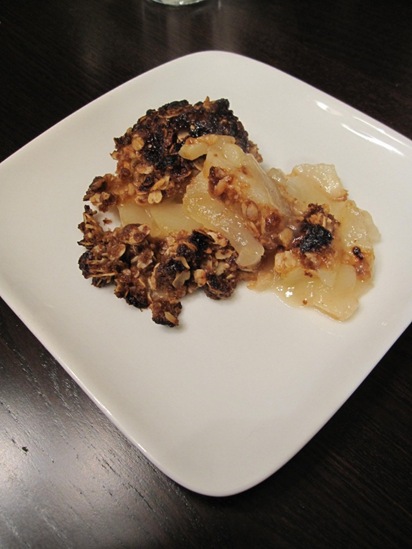 Diana made Ellie Kreiger’s Pear Crumble for dessert. We broiled it at the last minute to get the crust extra crispy and BURNED it!!! It was fine with me because I love burn, but I feel bad 😳 It was amazing – very gingery! And very healthy tasting 🙂