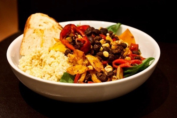 A skillet of black beans, peppers (a gift from Karen’s friend Tracy’s garden!), spinach (a random grocery stop pickup), frozen corn plus cumin, chili powder, a dash of cinnamon, a dash of cocoa powder and salt.