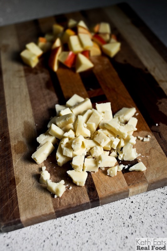 Cube up about half a cup of sharp cheddar cheese. You could also use grated cheese too. I love the tangy bite of sharp white cheddar.