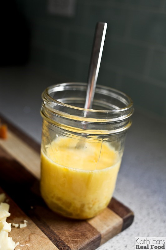 Beat 4 eggs in a jar and add 2 pinches of salt and a tablespoon of water. (FYI this recipe serves 2!)