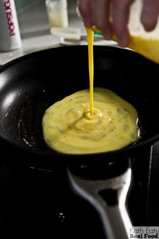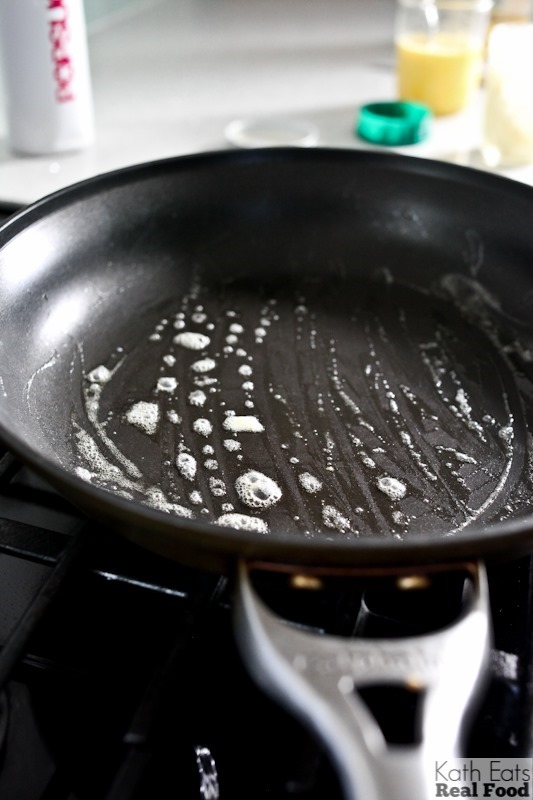 Melt butter in your pan – don’t skimp! I have horrible luck cooking eggs in stainless steel pans, so if you only have one of those, use a TON of butter!