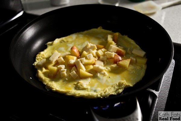 Once the omelet is set – about 2-3 minutes later, add half of the cooked apple and cheddar