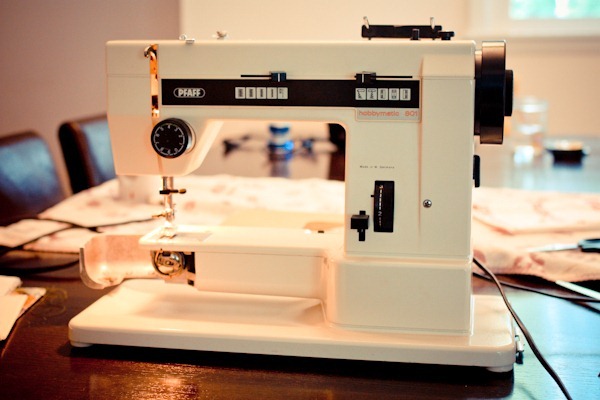 Karen actually brought this sewing machine home from Germany on an airplane (as a carry on!) in 1984. She says it’s top of the line : ) I have a little bit of sewing experience – when I was in high school I made a few dresses, which were more like sacks with a halter top strap. They were cute, but not the easiest to get on and off! But it’s been about 13 years since I last put the pedal to the metal –