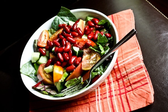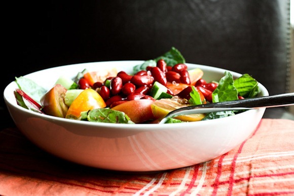 Greens, GARDEN TOMATOES!!, cucumber, pepper and kidney beans in Garlic Gold Lemon Vinaigrette.