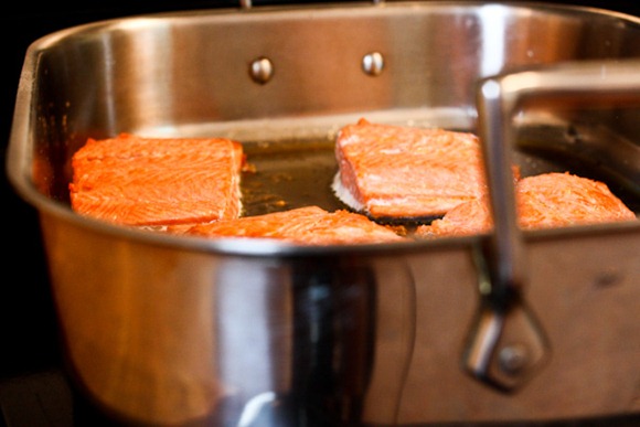 Tonight’s salmon was from the Copper River Salmon Flavor Sampling Club! They have been more than generous providing our family with the true taste of Alaskan salmon. Tonight’s fish was Sockeye from the Prince William Sound – on the other side of the region as the last Sockeye shipment. This one felt a little bit tougher to me than the first Sockeye and the king, but our seared + oven-finished at 400* for 10 minutes method was still delicious.