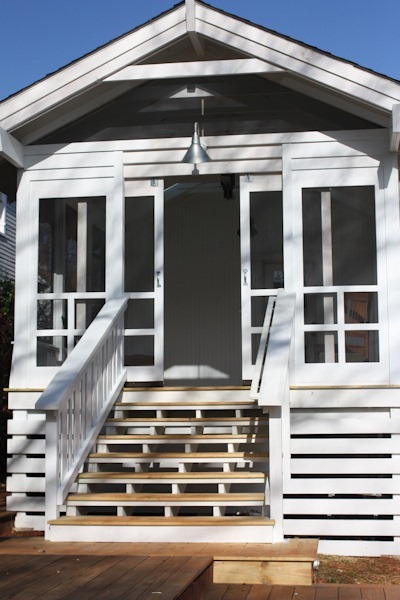 I absolutely LOVE your porch–esp. the skylights, ceiling, beadboard, sliding door(s), and wide steps, perfect to hang out on. It’s almost like having a little cottage on the back of your house. You could even sleep out there some warm summer night!