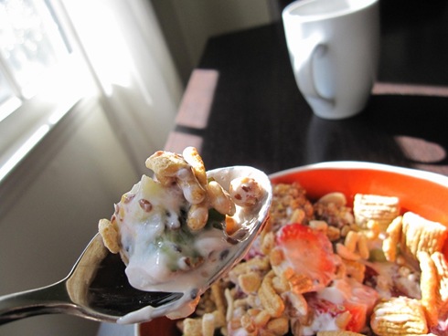 My oatmeal was killer this morning and held me over until after 1:00. I wasn’t even grumbly hungry – just weak hungry – so I made lunch. And I ate just what I craved: yogurt, fruit and cereal. I actually had out the ingredients to make a salad too, but after looking at them I decided they weren’t that appealing and that I don’t have to eat veggies with every lunch.