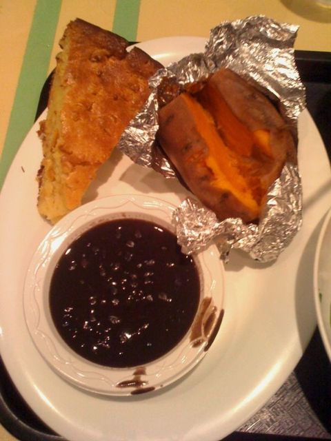 On the side I got a sweet potato and a side of black beans for filling warmth. It was soooo good! My lunch came with a surprise slice of cornbread that was out if this world good.