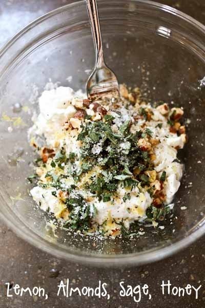 - Lemon Almond Honey: Chop almonds and rosemary. Zest and juice lemon. Combine all ingredients into bowl with goat cheese and mix thoroughly with a fork to combine. Stuff into half of the mushrooms.