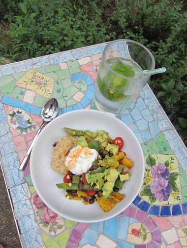 Matt and I raced around at 5:00 to get dinner ready so we’d be able to eat right after our phone interview. We had soaked and then simmered some black turtle beans earlier in the day, so we just had to chop up some veggies and cook a grain to make a nice salad. I’m call it a Siesta Salad because you can make dinner and then take a siesta and relax!