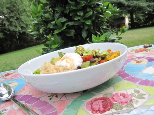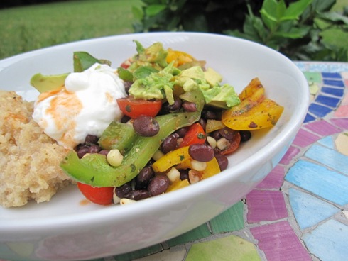 The black bean salad was composed of about 2 cups black beans, 1 cup cherry tomatoes, 1 ear of corn,1/2 each yellow and green bell peppers, and a dressing made of 1 lime, 1/2 tsp cumin, + chili powder, sprinkle garlic powder, 2 pinches salt, dash hot sauce. We topped the salad with plain Oikos and fresh avocado