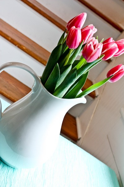 I love your tulips! My boyfriend just brought me home tulips on Friday night and they are oh so pretty. I will try putting a penny in the water like the reader suggested above so they last longer.
