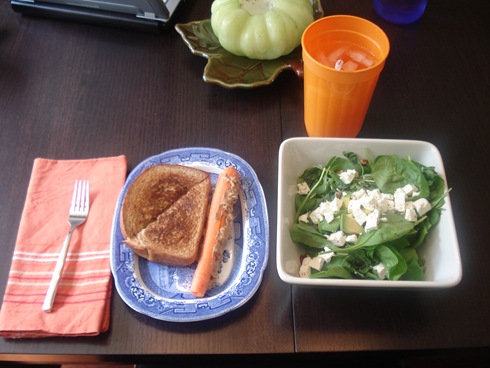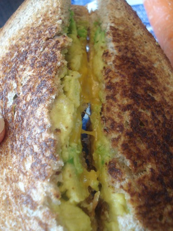 I also made an Avocado-Cheddar grilled cheese – with a dab of whipped butter (got this instead of Smart Balance yesterday for a change). I used shredded cheese today and I think that helped make the cheese stand out more.