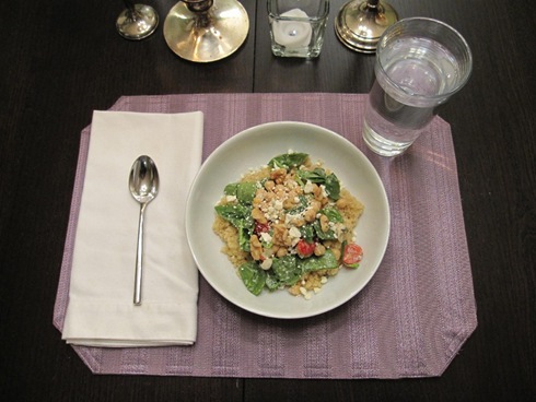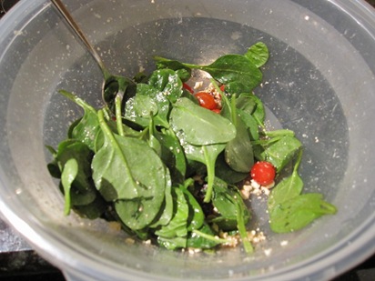 I also ate my leftover lunch fruit! It was SO FUN to eat during class 🙂 We had an early dinner so I didn’t need a snack, but while I was cooking I had a few bites of this leftover salad from last night to tide me over. All the good stuff is on the bottom!