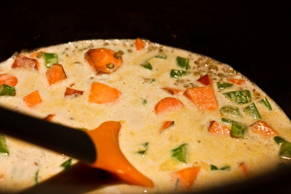- Add coconut milk, water, lentils and spices.