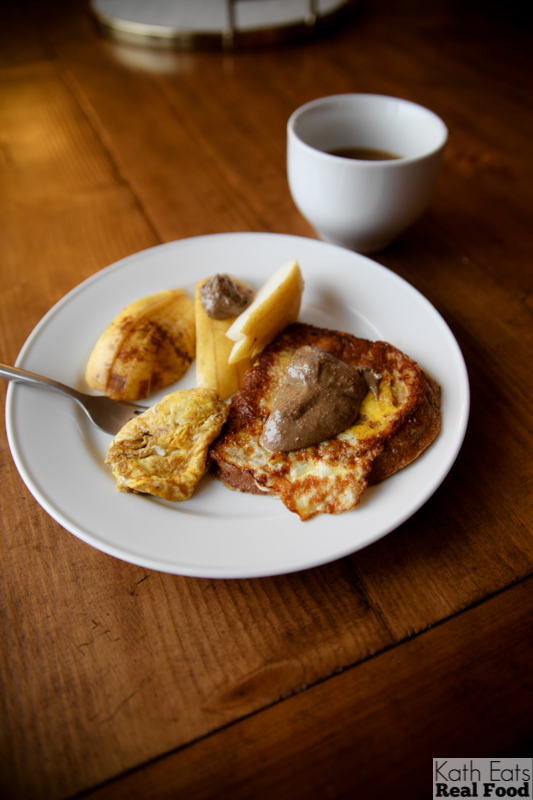 Cozy breakfast numero uno – French toast with egg, pear and sunflower butter.