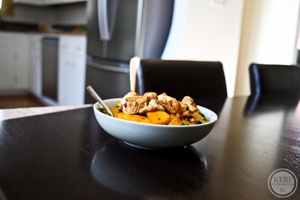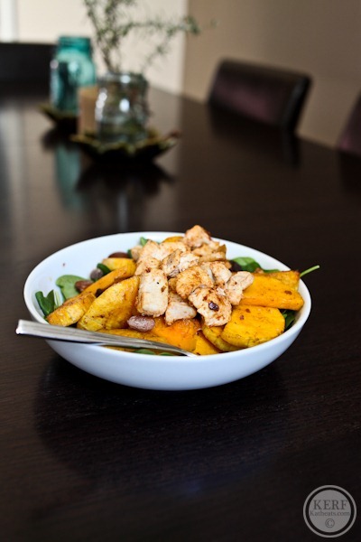 A little chicken breast, some squash, spinach salad, chopped apple, raisins and almonds. Since all the ingredients were prepped, it took no time to assemble lunch.