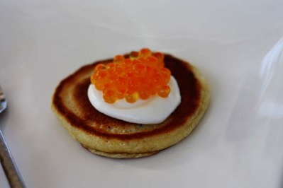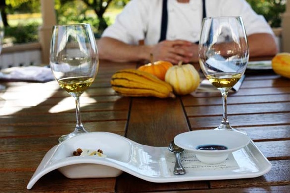 The First Course was Long Island Cheese Pumpkin Soup with coconut milk. Paired with the 2009 Grande Reserve Sauvignon Blanc along with a Johnny Cake with Trout Roe and Sour Cream paired with the 2007 Highland Estates Camelot Highlands Chard. A true buttery delight with a crisp finish.