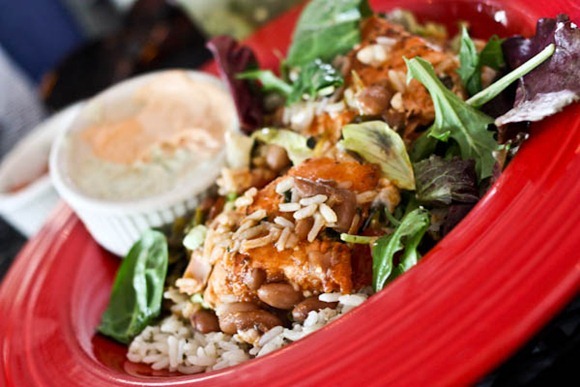 Drunken Salmon over beans + rice with a side of chipotle crema.