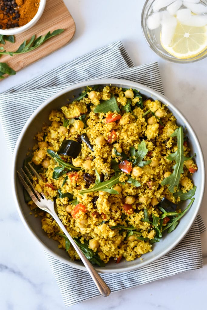 This millet salad is packed with vegetables and warm spices like garam masala and turmeric. Chickpeas make it worthy of a stand-alone meal.