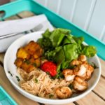 Matt and I love shrimp. And cooked pineapple. And salads. And Rocky Mountain Sriracha! So on a weeknight when we had the ingredients on hand, we created this shrimp bowl that was too fun to not write down.
