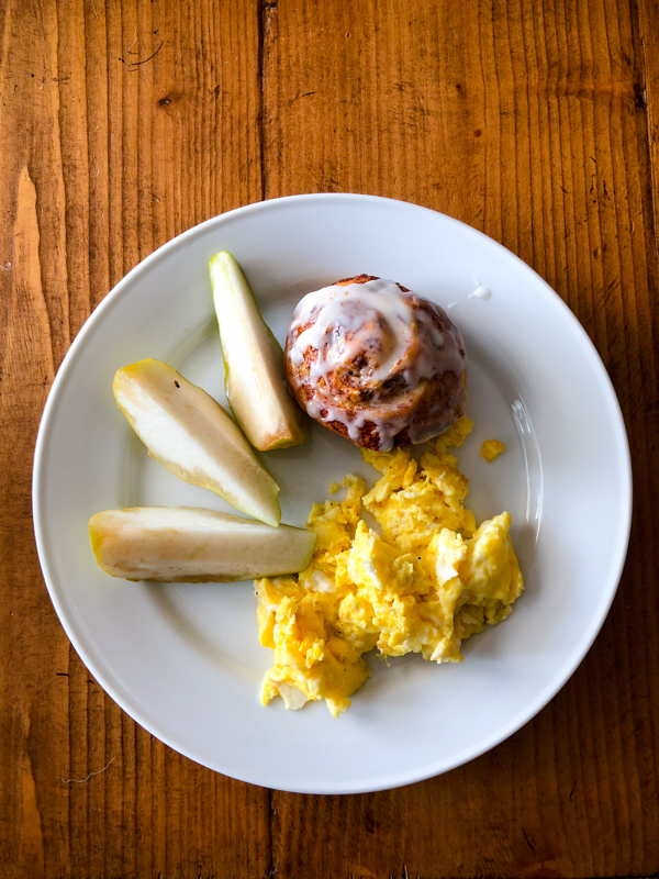 Thomas impulse bought some easy bake cinnamon buns for weekend breakfast, and we had those with eggs and pear in the morning. Pretty tasty!
