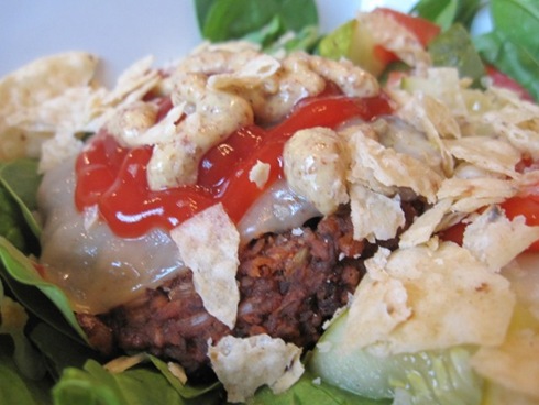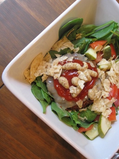 Another rice, bean + beet veggie burger with some melted jack cheese, ketchup and mustard, with pickle and tomato and some chips over spinach. Burger, deconstructed.