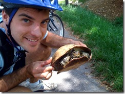After a bunch more frustrating blog stuff, we finally went for an 11:30 AM workout. It was a nice one – biking there, where we ran into a turtle!! Luckily I had my iPhone on my to stay in touch with blog emails, so I got a photo. Brave boy –