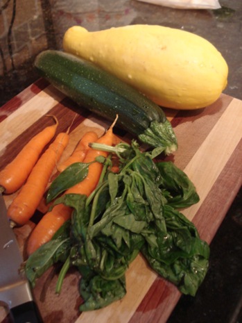 Veggies included the jumbo squash, zucchini from our garden, CSA carrots, and CSA basil.