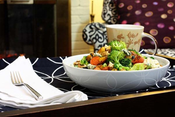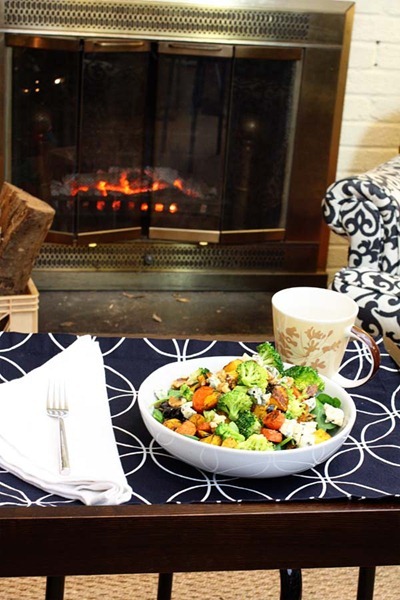 I love roasted veggies on a salad- esp. w/blue cheese! Cute fireplace.