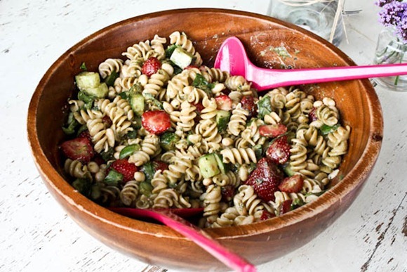Mmm such a great way to use strawberries! Love them in my salads usually, but added to pasta salad sounds even more yummy-licious. 🙂