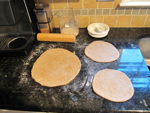 Matt whipped up some of his whole wheat pizza crust and rolled it into 2 small and 1 big circles: