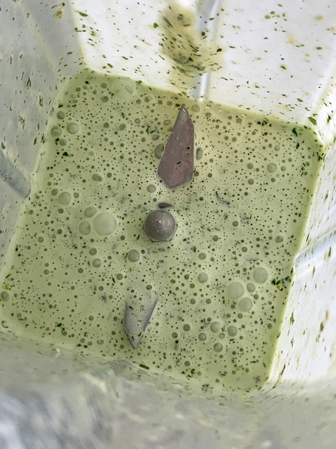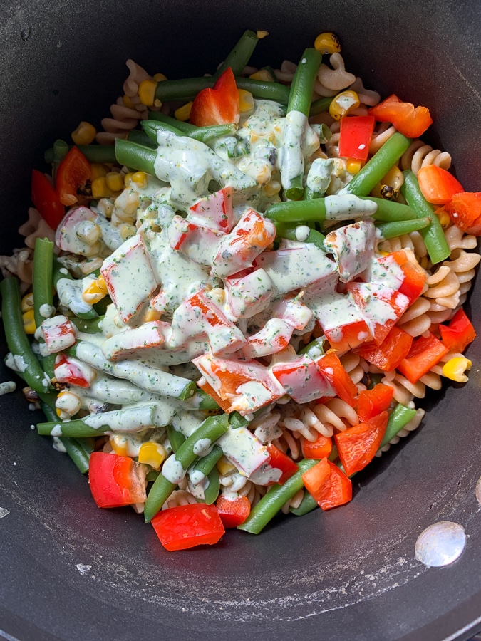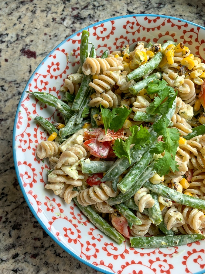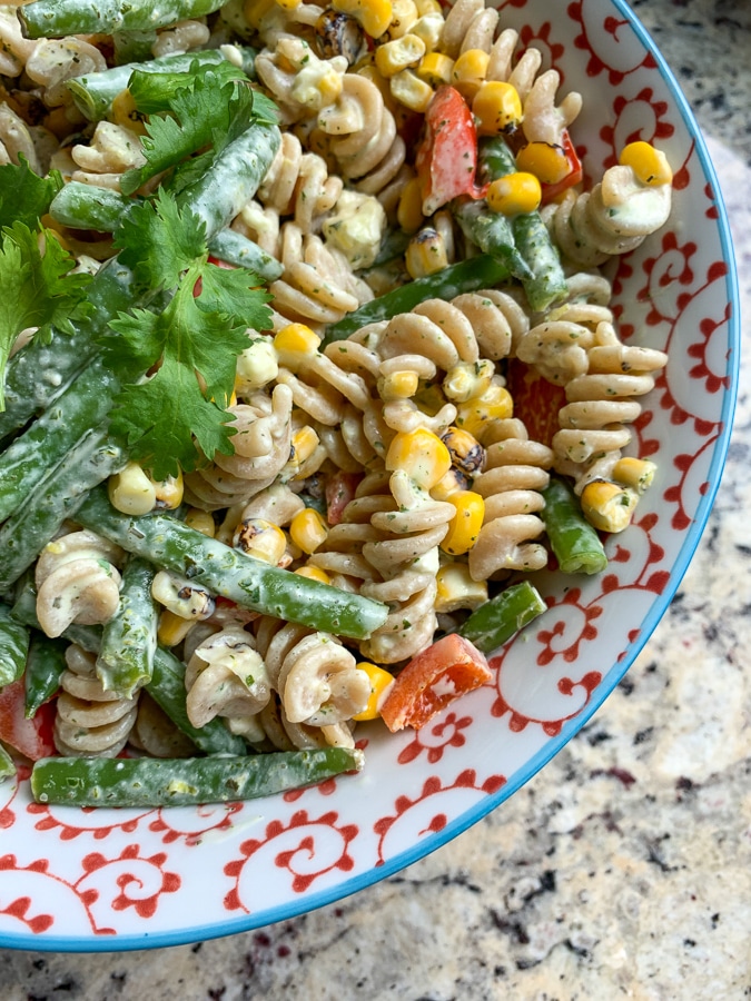 I used fresh cilantro plus dried dill and parsley for a blend of green flavor. The dressing is made with sour cream, mayo, and lemon juice for a creamy style that sticks to your pasta and soaks in over time. Shout out to Plenty’s Della for the idea to blend sour cream + mayo. It’s a winner!