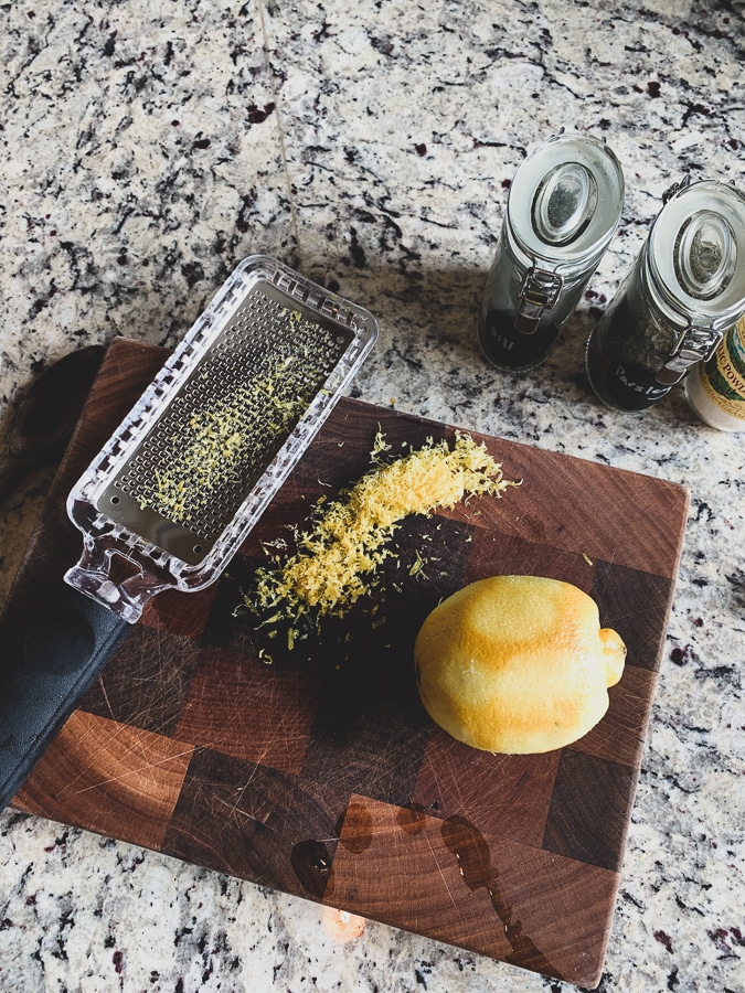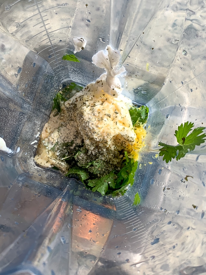 - To make dressing, add lemon zest through pepper in a blender and blend.