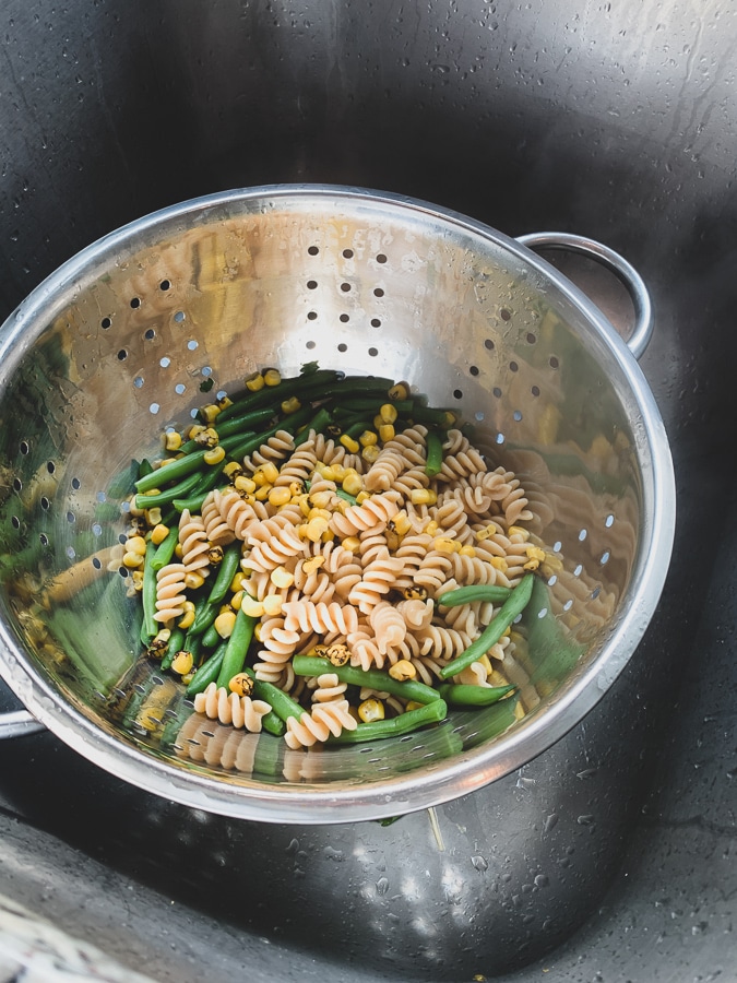 - Cook pasta according to package. With 3 minutes remaining, add beans and corn. Drain.