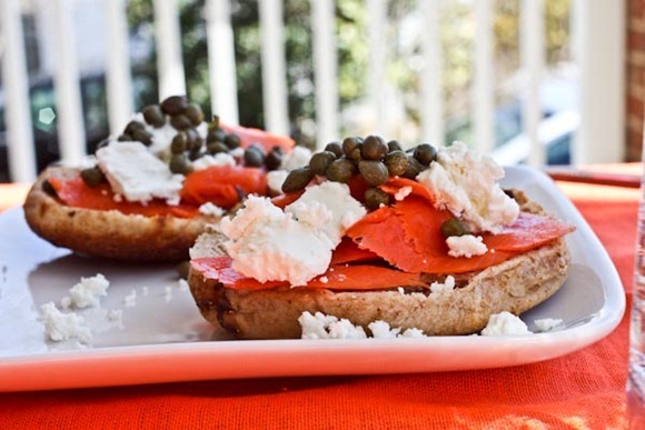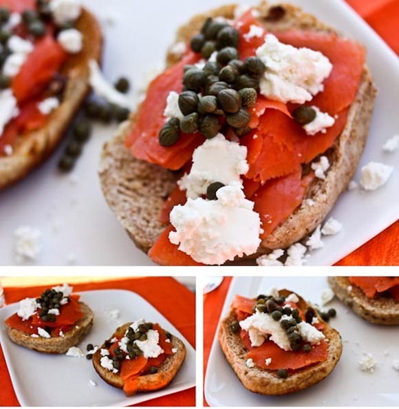 Smoked salmon, goat cheese and capers on a frozen/thawed Bread Basket English muffin. 1,000 times better than a bagel!
