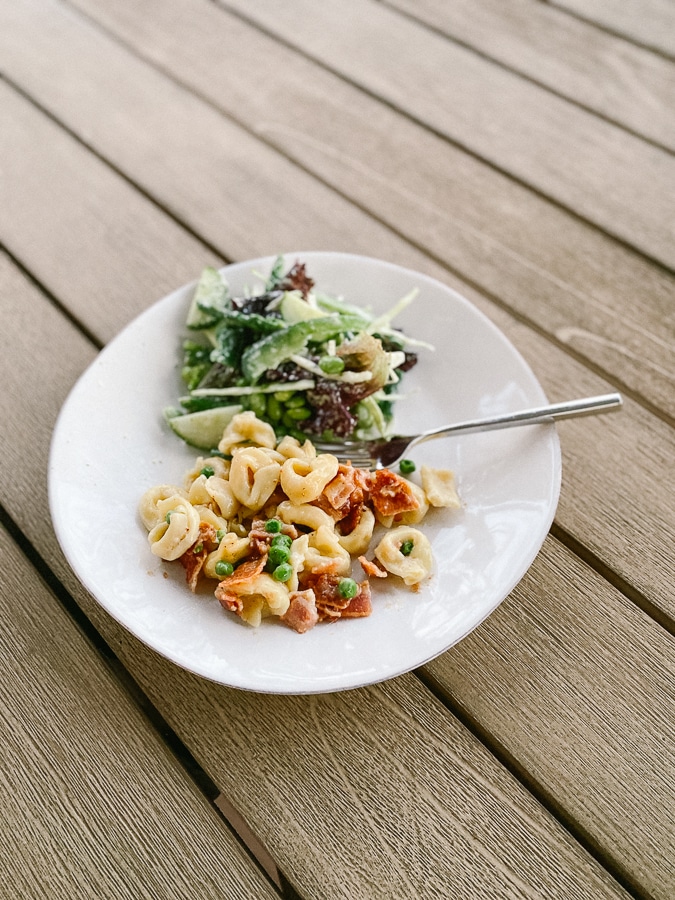 Tortellini with peas + bacon and Goddess Salad from Plenty