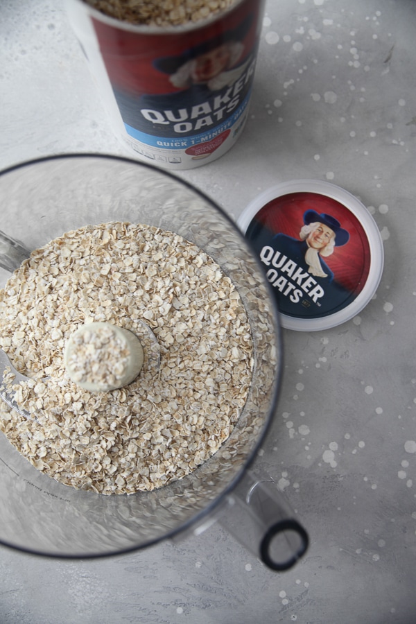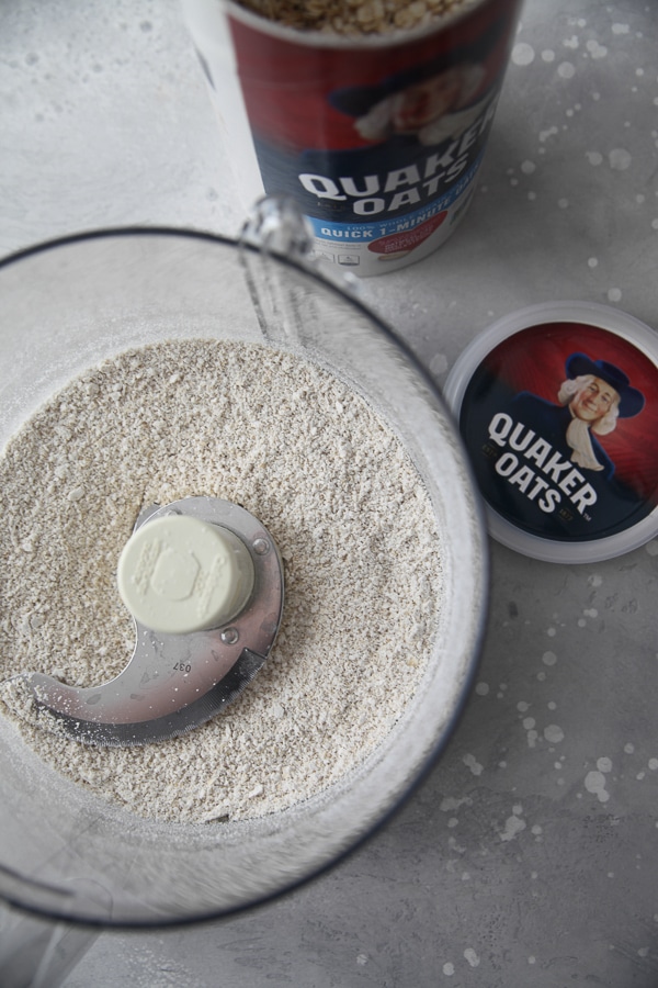 Making oat flour is super easy if you have a food processor. Just blend rolled or quick cooking oats for one minute until you have a fine flour.