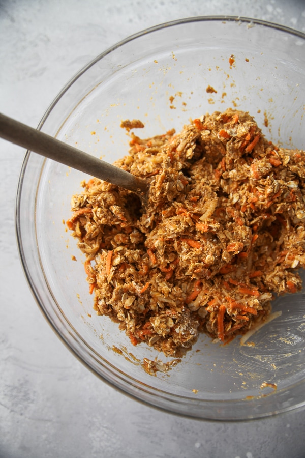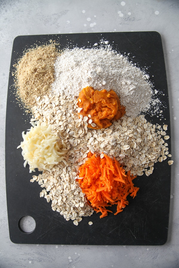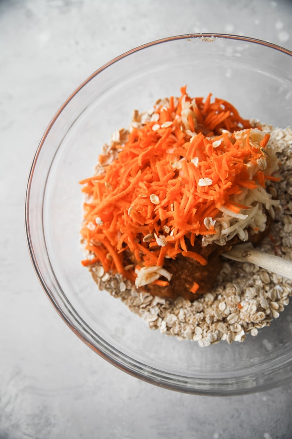 - Preheat oven to 350 degrees. Line baking sheet with parchment. Make oat flour in a food processor with the blade attachment. Switch to grate attachment and grate peeled carrots and apples.
