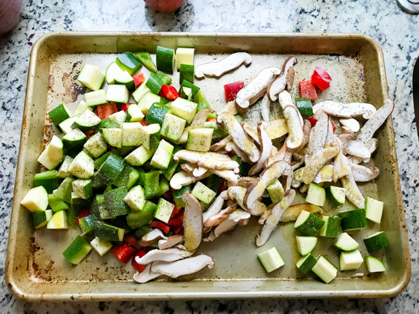 I’ve been doing a sheet pan of roasted vegetables every week lately, usually while I’m cooking Sunday or Monday night’s dinner (whichever requires the oven!). Then I have veggies to use for lunches or last-minute dinners all week long. This week’s was zucchini, two bell peppers, and a package of shiitake mushrooms that were to die for when they were roasted! So buttery-good. I drizzled olive oil, salt, pepper, and dill over the veg and roasted it for about 30 minutes.
