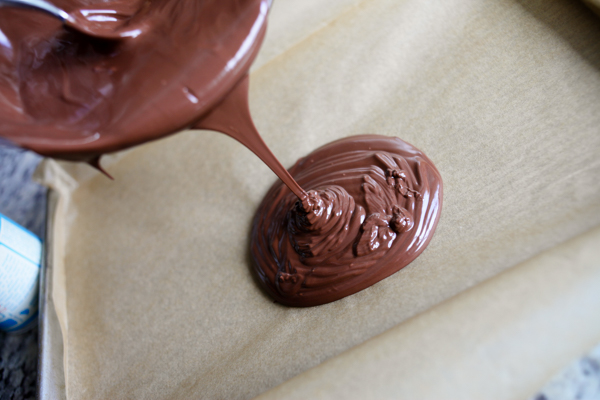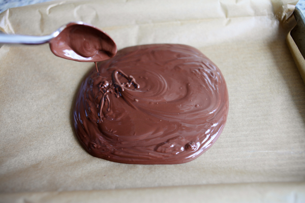 - Pour chocolate out onto parchment paper and spread into a large square.