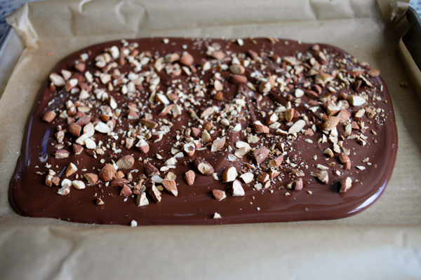 Cover a sheet pan with parchment paper and pour the chocolate on top, forming the general shape of a square. You want the bark to be thin, but not so thin that it can’t hold an almond. Think about the thickness of a fruit leather.