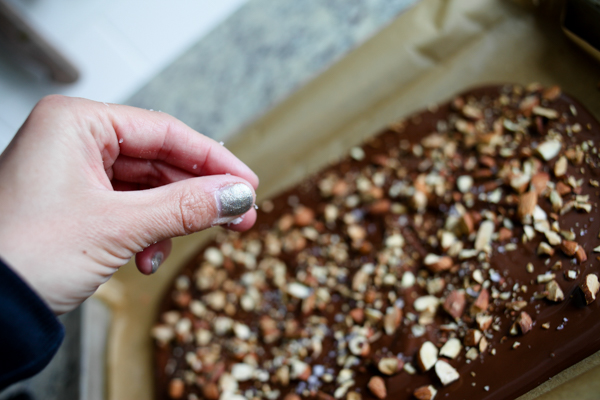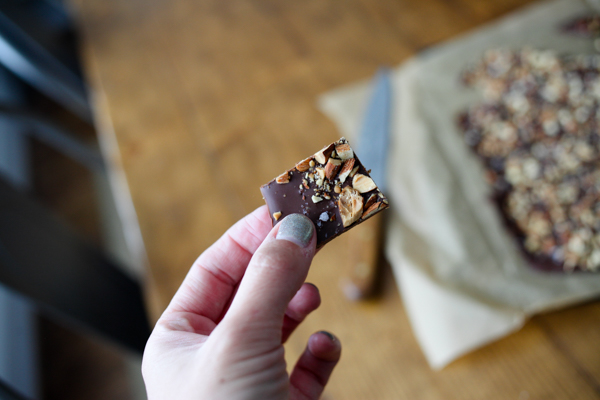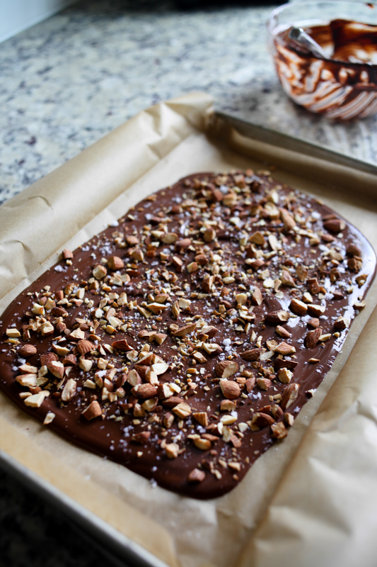 I loooooove any kind of salty sweet combo. Salted Caramel ice cream is one of my top flavor choices, and when I am shopping for chocolate bars I always look for the salted almond/hazelnut/caramel blends. Thomas loves a little something sweet after dinner and the salted almond dark chocolate bars we’ve been buying are costing us a fortune per ounce, so I decided to surprise him with a batch of homemade chocolate bark. Of course, I’ve been consuming my share too ; )